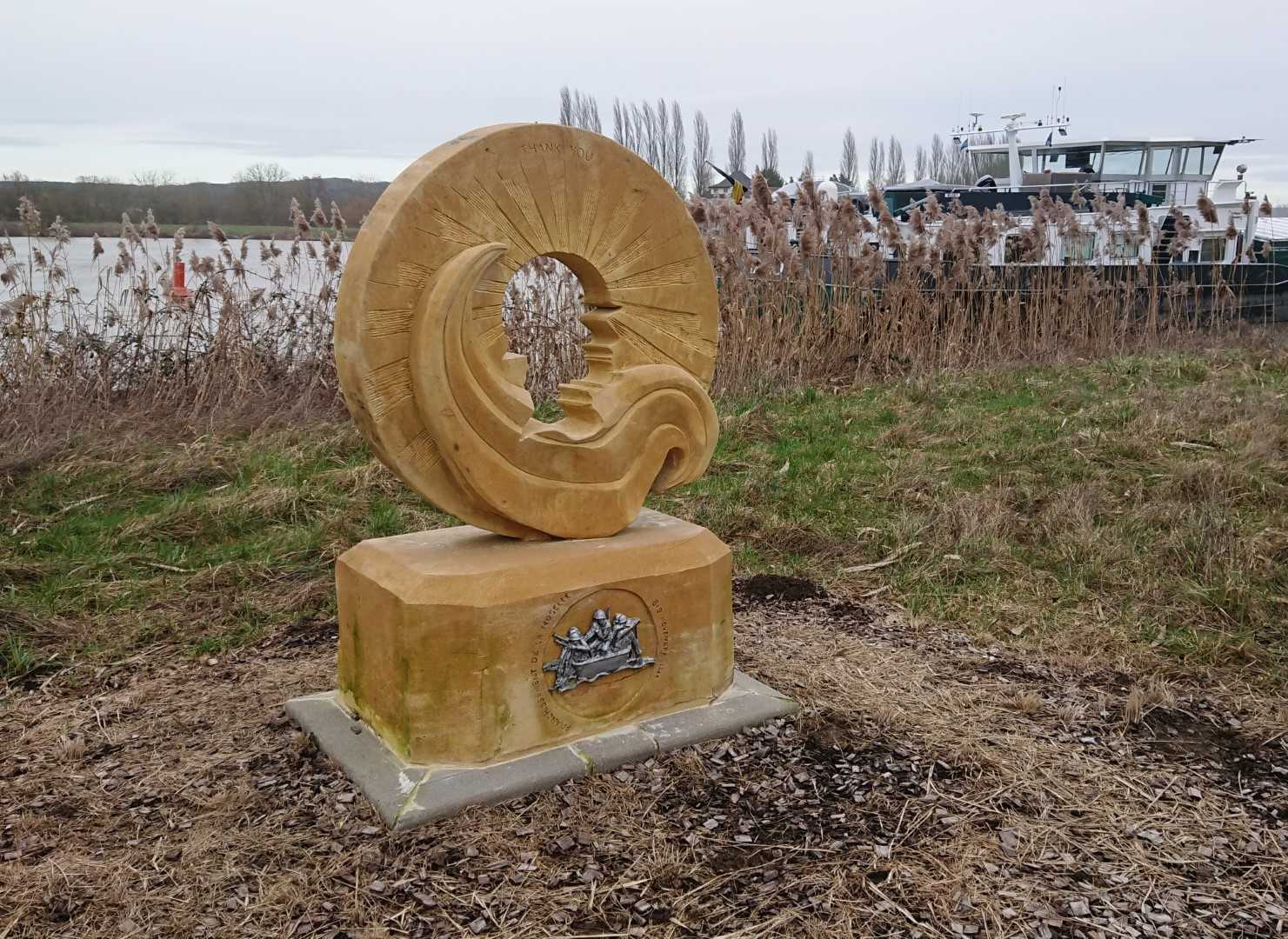 Puis par un petit chemin à l’arrière des maisons du bourg, nous avons gagné la route qui mène à la Moselle où se trouve un dispositif de chargement d’anhydrite dans les péniches. À deux pas, une sculpture récente signée Sylvain Divo commémore les 80 ans du franchissement de la Moselle par les troupes alliées en novembre 1944.