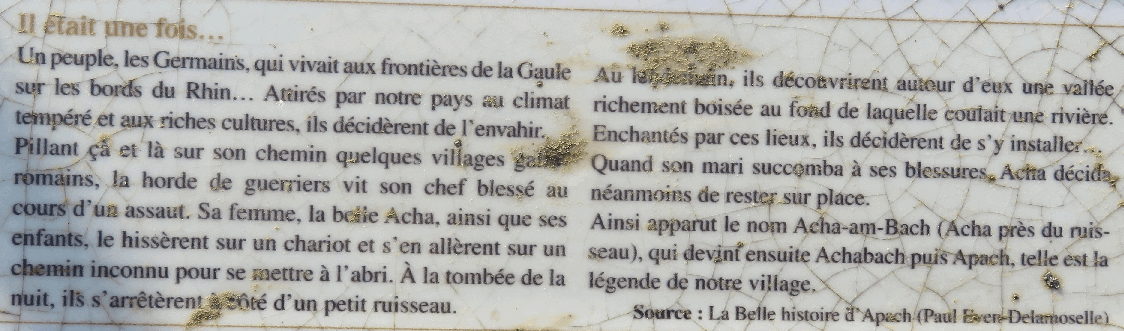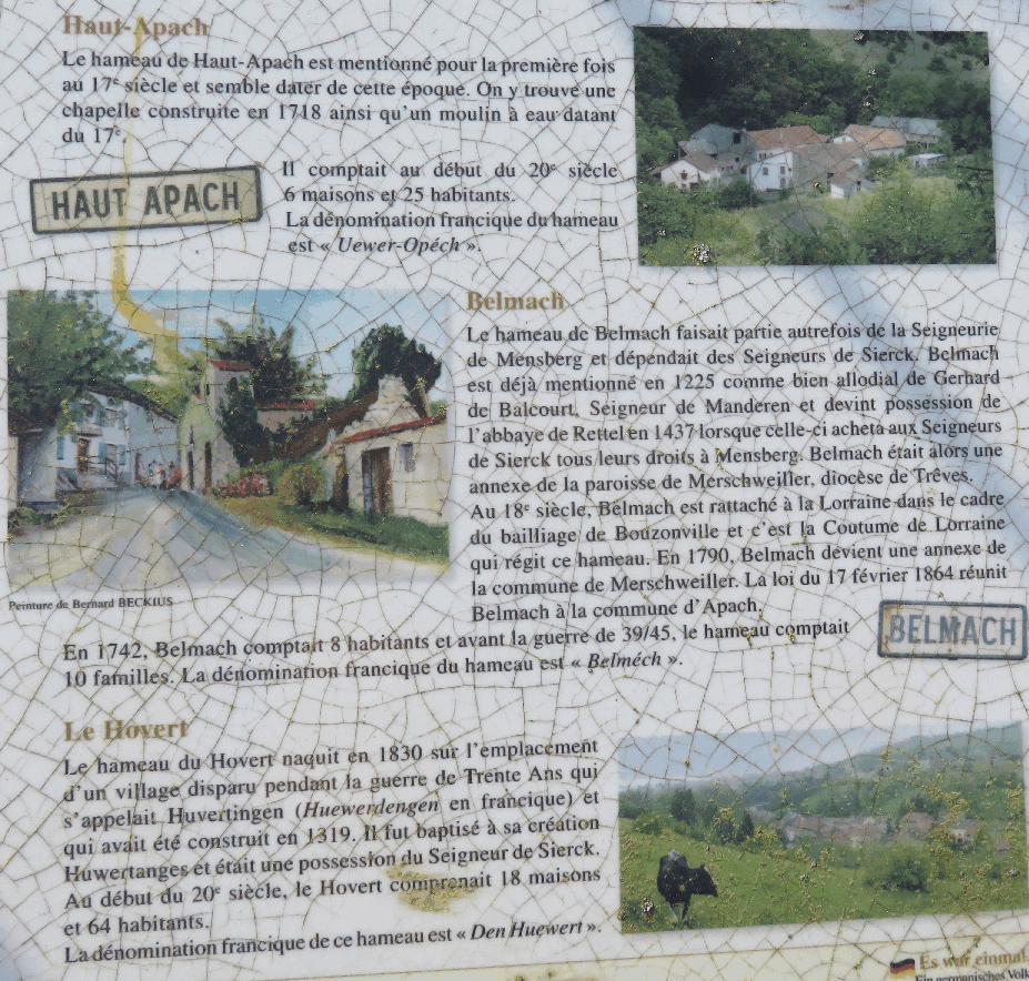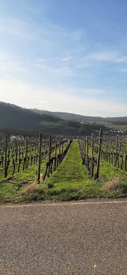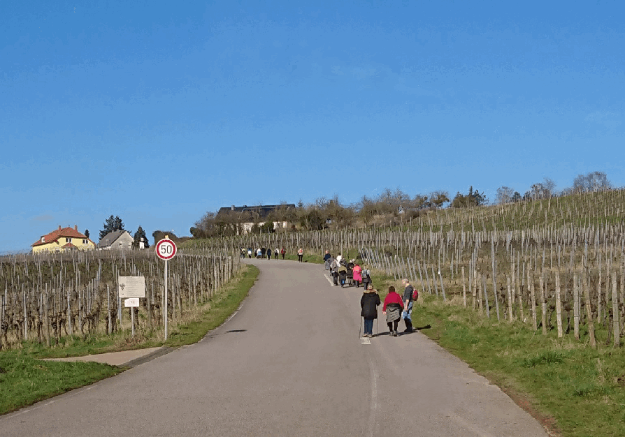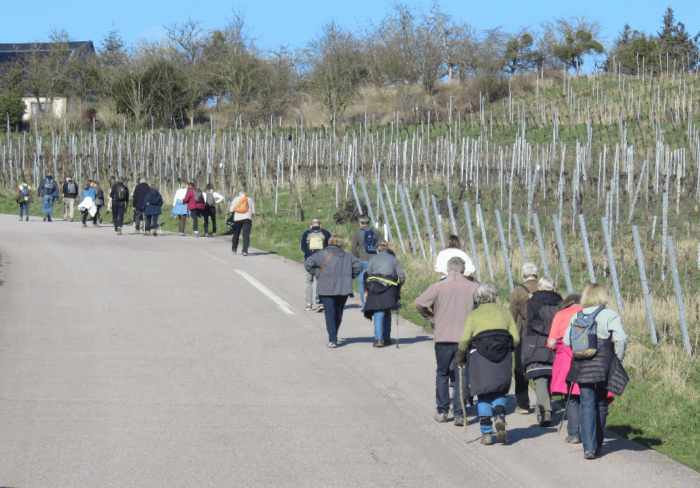 Partant du hameau de Kitzing, nous avons gagné Apach en longeant le ruisseau de Manderen par la petite route bordée de prairies qui serpente dans cette vallée ombragée. Après la traversée du village, le parcours s’est orienté vers une montée en direction de Perl, en Allemagne, par une route au milieu des vignes qui offre de belles vues dégagées sur la vallée de la Moselle et les paysages transfrontaliers. Traversant Perl, le chemin s’est poursuivi jusqu’au carrefour giratoire situé en contrebas, puis c’est la descente vers le centre d’Apach et le retour vers Kitzing effectué par le même itinéraire à nouveau le long du ruisseau.