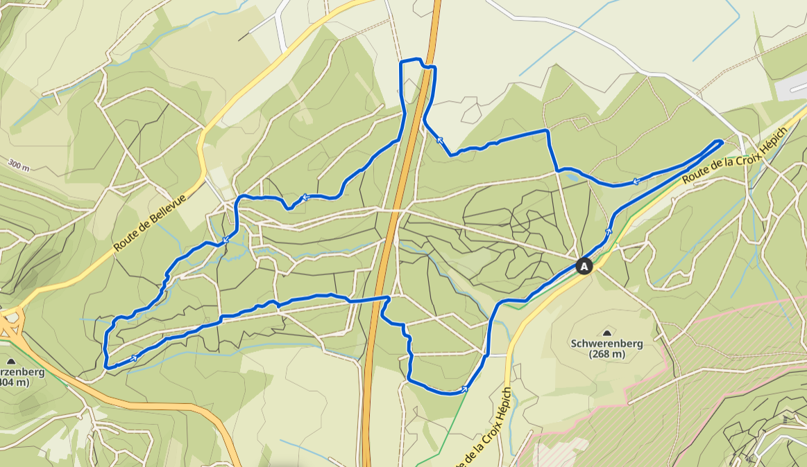 Départ direction le Chemin des Pèlerins en longeant la D14a, puis direction Oeutrange par le bois de Haselbusch. Passage sous l’autoroute A31 pour aller vers le stade de foot d’Oeutrange.